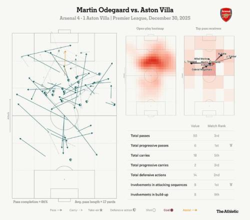 英超第19輪焦點戰,阿森納主場4-1大勝阿斯頓維拉,賽後,The Athletic發表專題文章,分析並點評了本場比賽。