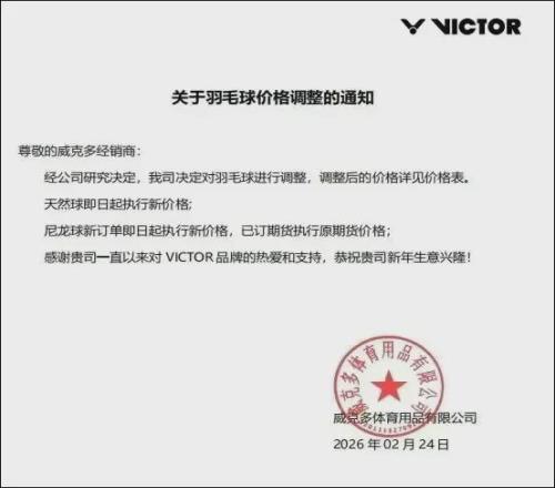 2月24日,VICTOR威克多率先宣布調價。接著斯莊格、齊克努也宣布調價,齊克努表示根據市場羽毛價格調節,公司決定對全係列羽毛球降價6元/筒。
