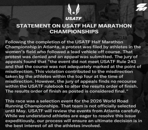據《Runner’s World》報道,美國田徑協會(USATF)在賽後發布聲明稱,部分運動員對比賽的組織提出了抗議,但是被駁回了申訴,隨後,這幾位運動員又進行上訴,而上訴審核委員會的最終裁定結果是,“比賽中所發生的問題違反了美國田徑協會規則第243條,而且在引導車出現偏離時賽道標記不足,這些違規行為導致了領先的選手被誤導。然而,根據美國田徑協會規則手冊,無法更改最終成績排名。已公布的成績排名將被視為最終結果。”