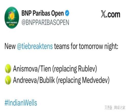就在外界一直在等待梅德韋傑夫和盧布列夫是否已經順利離開迪拜的最新消息時,印第安維爾斯官方的另一則新消息卻提前來了,直接官宣取消了這對哥倆的混雙搶十表演賽資格,由勒納錢和布勃利克替代。
