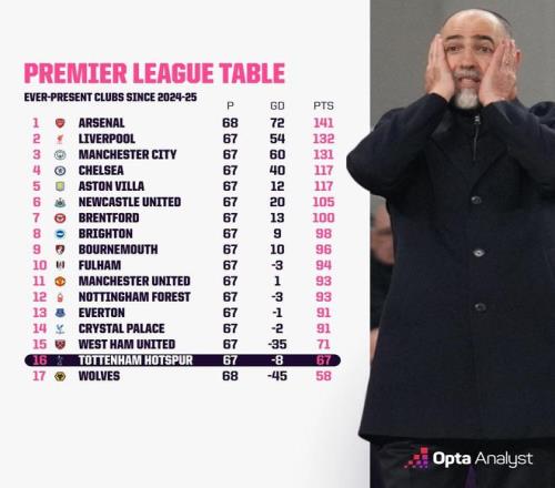 北京時間3月6日,英超聯賽第29輪,熱刺在主場1-3不敵水晶宮。本賽季迄今為止,熱刺29場比賽7勝8平14負積29分,暫列英超積分榜第16位。據知名數據平台Opta統計,自2024/25賽季以來,在17支始終參加英超聯賽的球隊中,隻有狼隊的總積分比熱刺低。
