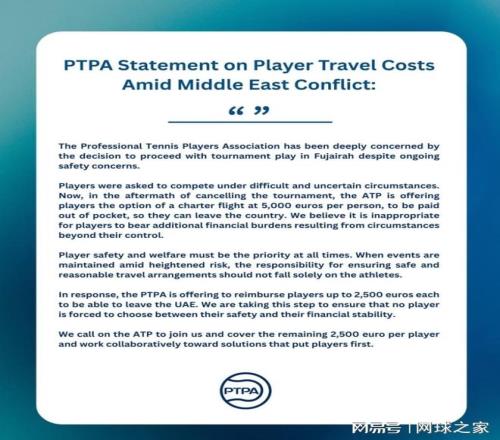 特別是PTPA(職業網球球員協會)第一時間介入這件事,對外鄭重表態會承擔每人的一半費用,剩餘費用由ATP負責後,更讓ATP承擔了非常大的壓力。