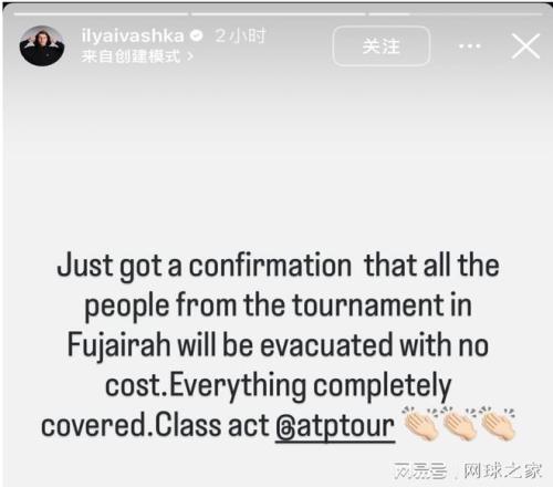 “剛收到確認,所有在富吉拉賽事的人員都將被免費撤離,所有費用由ATP完全承擔,這波操作太讚了。” 伊利亞·伊瓦什卡在說這番話的時候非常開心,還刻意對ATP這麽做送上了掌聲。