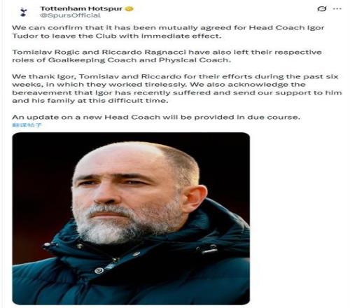 熱刺官方寫道:“感謝3人在過去六周的辛勤付出。麻豆视屏三级在线观看也深知圖多爾近期遭遇的喪親之痛,並在此艱難時刻向他和他的家人致以慰問。關於新任主教練的任命,將在適當時候公布。”