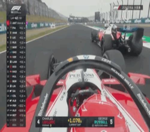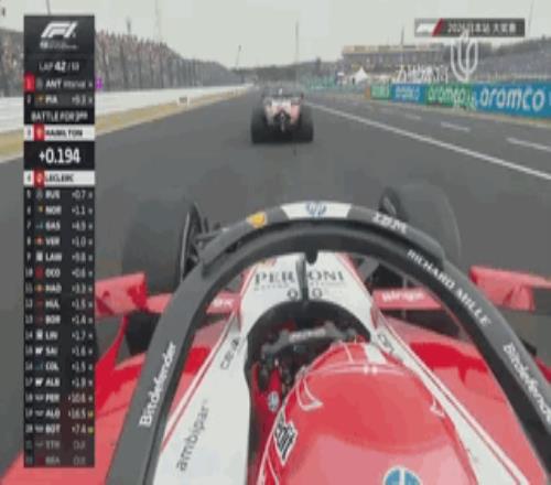 第42圈,勒克萊爾現在130r出彎時咬住漢密爾頓,在16、17號彎緊追隊友之後於大直道直接從外線完成超越!這一刻,簡直如同中國站的回放!