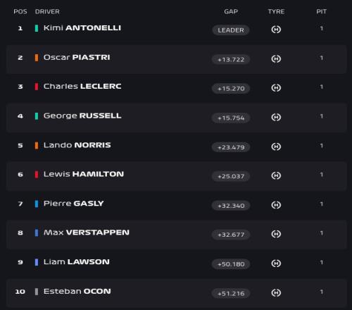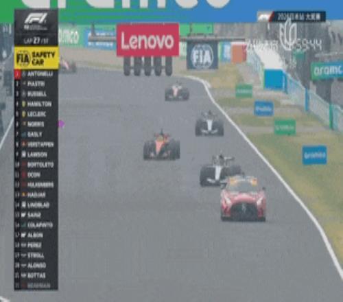 克拉平托在14號彎的防守線路值得商榷,但黃旗的出現讓還沒有進站的安東內利和皮亞斯特裏獲得了一次"免費"的進站!出站後安東內利繼續排名第1,皮亞斯特裏第2,拉塞爾第3,漢密爾頓和勒克萊爾分列第4和第5。