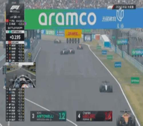 第15圈,安東內利在130r極其強硬的從外線獲得優勢,再一次複刻了自己在組合彎的超車動作,超越勒克萊爾來到第3!但出彎時賽車出現打滑的情況,隨後被勒克萊爾在大直道上超越重回第4。