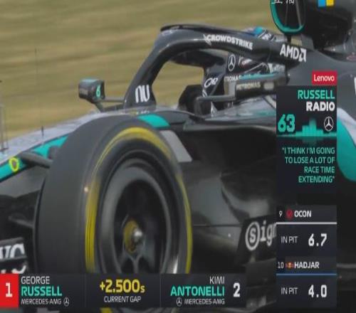 麥克拉倫兩車都完成進站,而梅奔雙雄依舊在賽道上沒有進站。隨後拉塞爾通過TR和車隊溝通,認為自己再不進站可能會損失很多時間,但車隊表示現在進站場麵依舊比較被動。