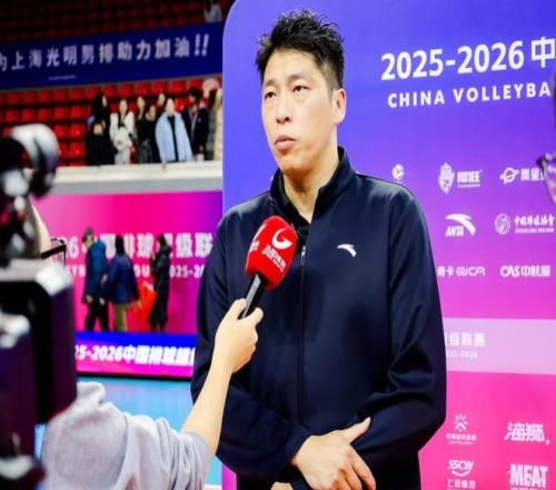 上海男排主教練沈瓊接受采訪。