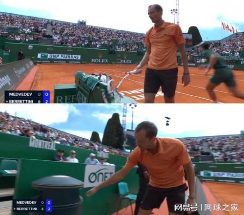在第二盤比賽中,梅德韋傑夫在0-2落後時情緒徹底失控。在一次回球出界後,他走到場邊,用力將球拍砸向地麵,隨後更是連續五次摔打球拍發泄自己的情緒。裁判給了他警告,但俄羅斯人的競技狀態並未因此有任何起色,他隨後被貝雷蒂尼連破兩局,比分迅速被拉開到0-5。最終,比賽在僅僅進行了49分鍾時戛然而止,比分是兩個6-0!