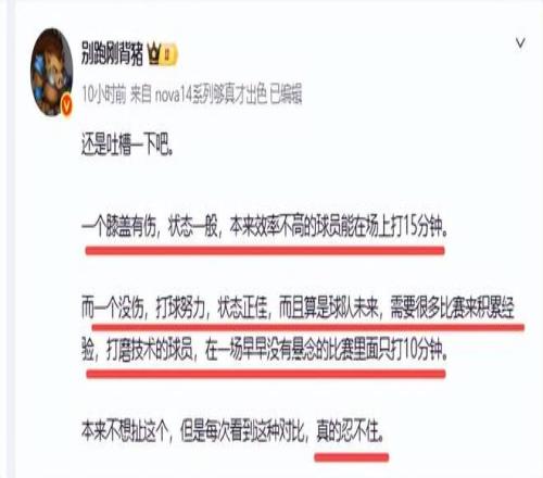 他說“還是吐槽一下吧。一個膝蓋有傷,狀態一般,本來效率不高的球員能在場上打15分鍾。而一個沒傷,打球努力,狀態正佳,而且算是球隊未來,需要很多比賽來積累經驗,打磨技術的球員,在一場早早沒有懸念的比賽裏麵隻打10分鍾。本來不想扯這個,但是每次看到這種對比,真的忍不住”。其實別跑剛背豬是拿有傷的張皓嘉與沒傷狀態好的陳家政作出對比,張皓嘉打了近15分鍾隻得5分,而隻打10分鍾的陳家政得了9分,誰的表現好誰的效率高,不是一目了然嗎?你杜鋒就是作妖,別在這裏扯什麽困難了,正像球迷怒噴的那樣,你就是困難的最大製造機!諸位,你們認同這個觀點嗎?